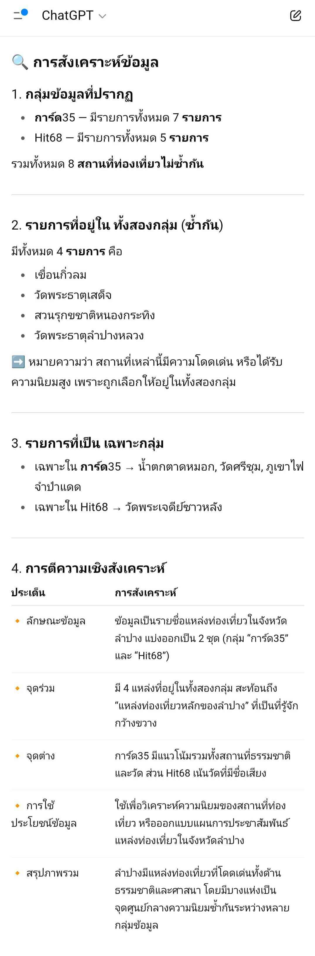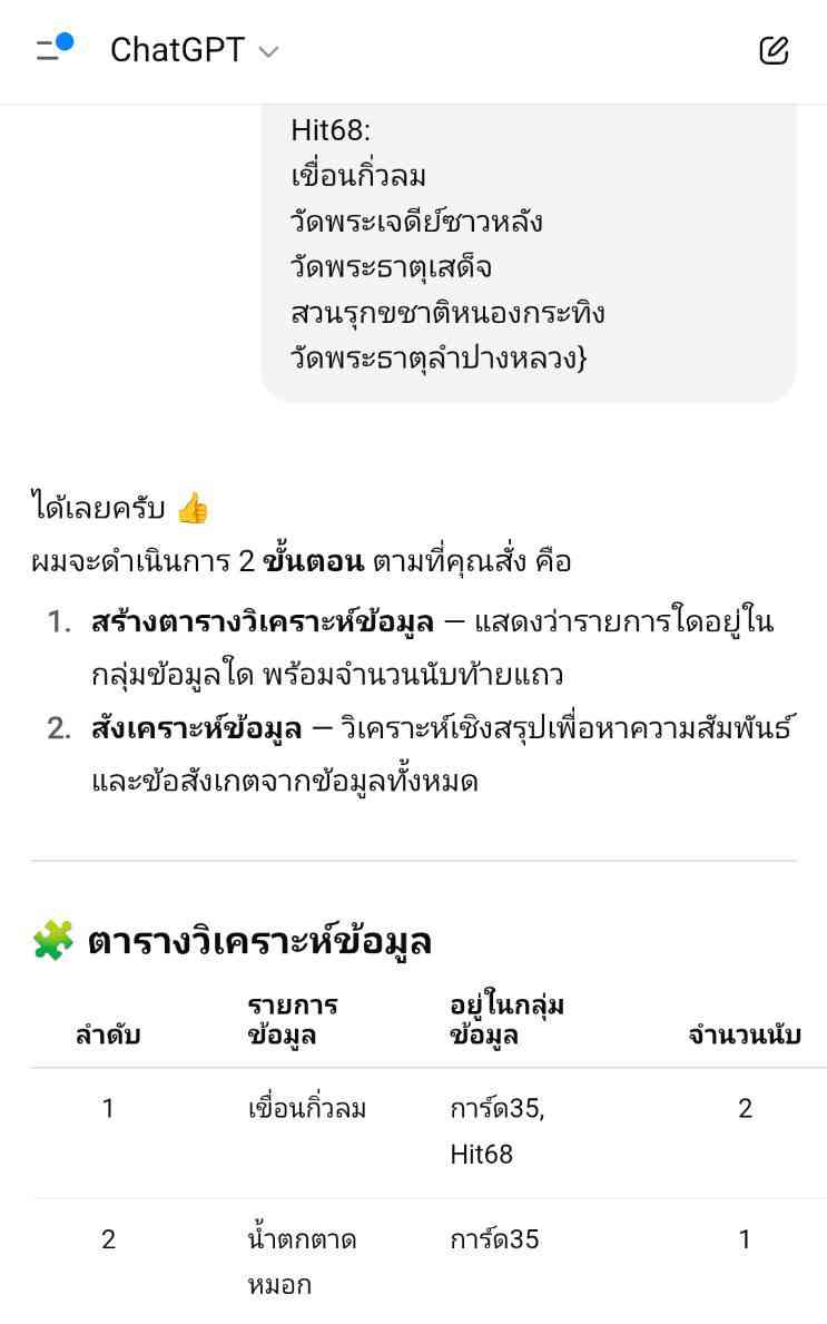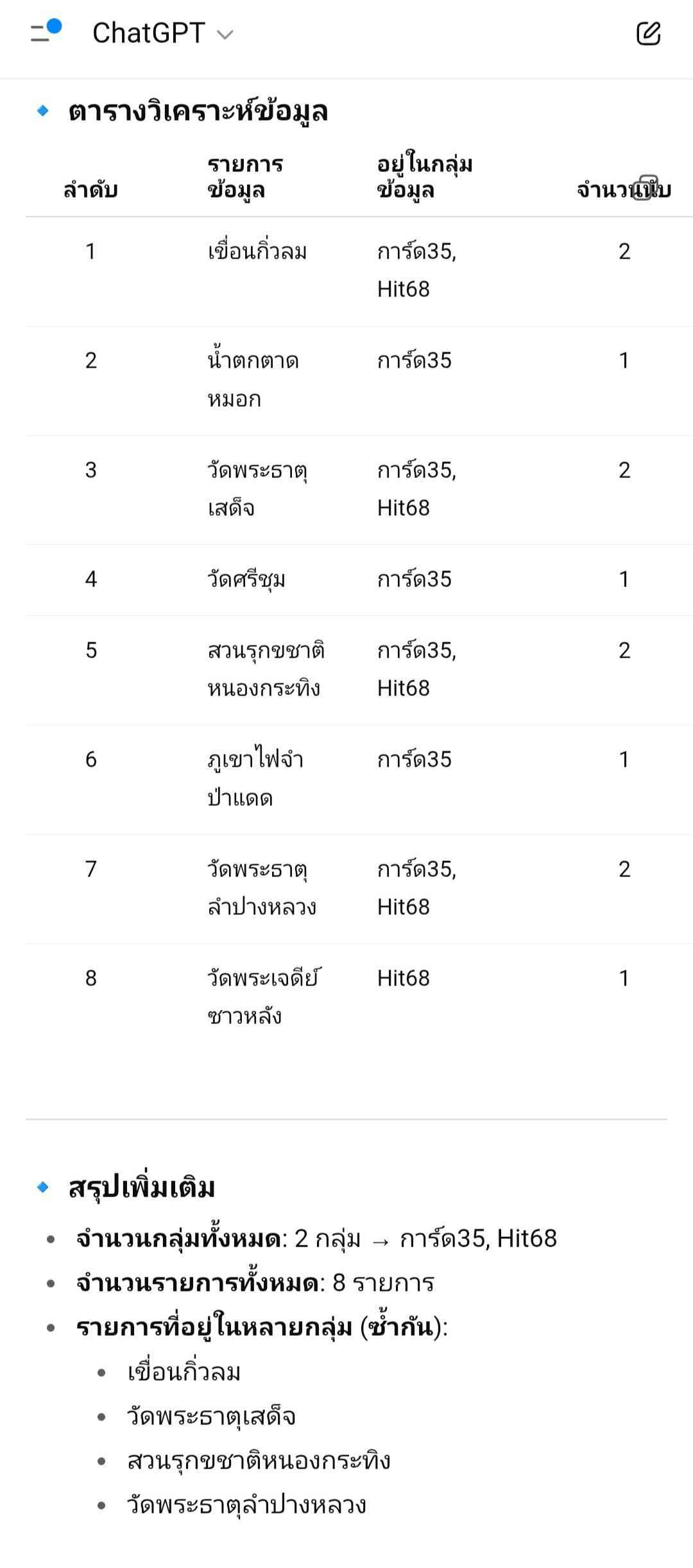 จากข้อมูลในเครื่องหมาย {} ข้างล่างนี้ แบ่งเป็น ชื่อกลุ่มข้อมูล คือ รายการที่มีเครื่องหมาย : ต่อท้าย และ รายการข้อมูล คือ รายการที่ไม่มีเครื่องหมาย : ต่อท้าย ดังนั้น จงสร้างตารางวิเคราะห์ข้อมูล ว่าแต่ละรายการจัดอยู่ชื่อกลุ่มข้อมูลใด พร้อมกับแสดงจำนวนนับที่ท้ายแถว จากนั้ให้ทำการสังเคราะห์ข้อมูลจากรายการข้างต้น {การ์ด35: เขื่อนกิ่วลม น้ำตกตาดหมอก วัดพระธาตุเสด็จ วัดศรีชุม สวนรุกขชาติหนองกระทิง ภูเขาไฟจำป่าแดด วัดพระธาตุลำปางหลวง Hit68: เขื่อนกิ่วลม วัดพระเจดีย์ซาวหลัง วัดพระธาตุเสด็จ สวนรุกขชาติหนองกระทิง วัดพระธาตุลำปางหลวง}
